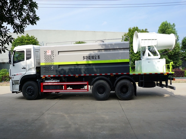 2.抑塵裝置采用國內(nèi)知名品牌,成霧量大、粒徑范圍大。霧炮噴射距離遠,且能實現(xiàn)俯仰角度可調(diào),滿足不同噴射距離工況的需求。使用副發(fā)動機驅(qū)動,傳動效率高。操作簡單,各功能通斷控制為電控氣動,一鍵切換,無需手動。
