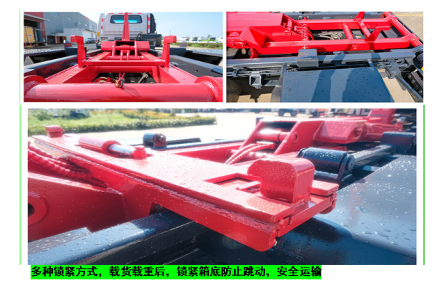 ◇上裝配置:強度合金鋼一體式主勾臂,加強型副梁,鑄鋼尾托輪,手自一體室內外液壓操控,上裝提升能力3000KG,?液壓完成上箱+下箱+鎖緊+自卸等作業,實現一車配多箱的循環轉運。可采用加強型上裝,油缸加粗,加裝液壓支腿,搭配建筑垃圾箱使用,提升能力6000Kg。