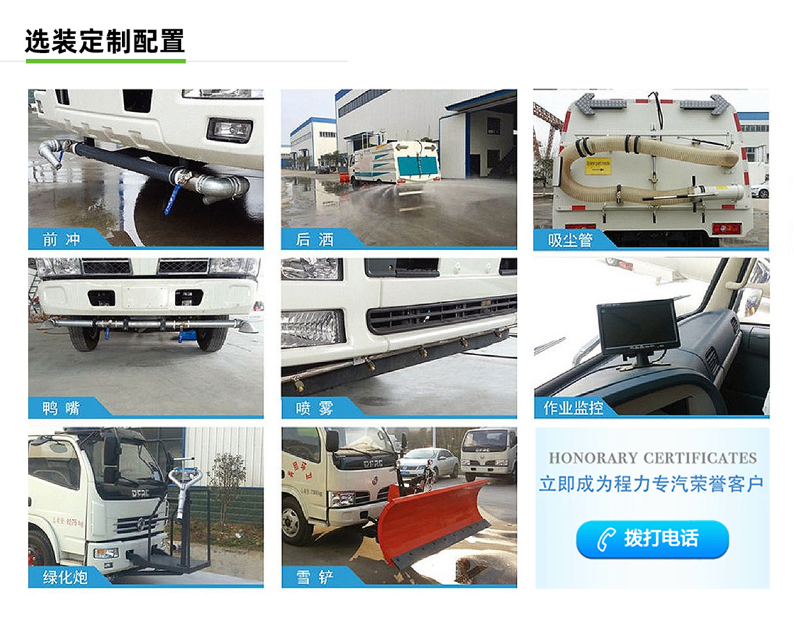 帶掃盤4把,江鈴副發動機;大力馬達;施耐德控件開關;臺灣電磁閥組;免維護自分離式離合器;免維護風機;不銹鋼水箱;不銹鋼垃圾箱;尾部LED箭頭燈;手動泵應急系統;刷臂轉動機構使用高新耐磨工程隔套,免打黃油;精密冷彎無縫液壓油管。